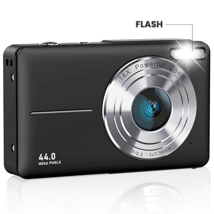 The package includes a 44.0-megapixel digital camera, a free 32GB SD card for storage, a USB charging cable, a protective camera case, a lanyard for easy carrying, and a user manual. The camera is made from high-quality, durable ABS plastic, ensuring long-lasting use.
